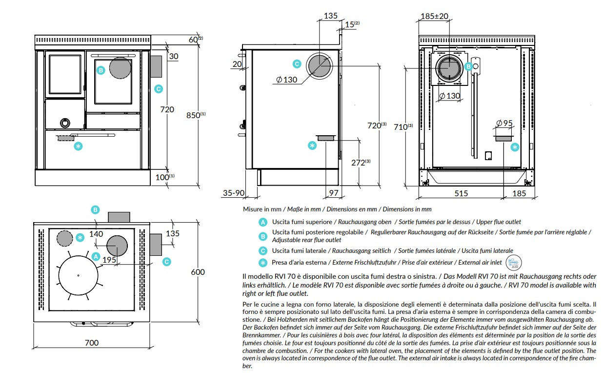 Die Herde sind mit dem Surround Heat® System für den Einbau zwischen Möbeln ausgestattet. Das zertifizierte Hitzeschutz-System verwendet isolierendes Material neuester Generation mit integrierten Kühlkörpern, die für eine optimale seitliche Isolation sorgen und eine gezielte Wärmeabgabe ermöglichen. Die Modelle RVI sind außerdem mit Elektro-Ventilatoren ausgestattet, welche eine bessere Wärmeabgabe garantieren. Im Falle vom Stromausfall kann der Herd jedoch ohne Weiteres verwendet werden, vorausgesetzt die notwendigen Sicherheitsabstände werden eingehalten.