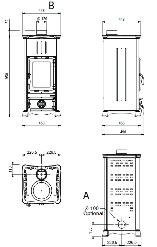 Sekundär und Primärluft sind verstellbar, außerdem verfügt das Gerät über voraustarierte Tertiärluft mit einem Nachverbrennungssystem. Die Feuerraumverkleidung besteht aus Gusseisen. Das Keramikglas an der Frontseite ist bis 750°C wärmebeständig.