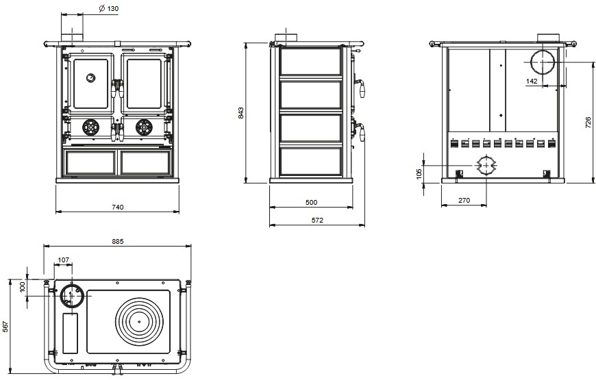 Die Konstruktion kombiniert robuste Materialien wie Gusseisen für Feuerstelle, Türen und Rahmen mit einem porzellan-emaillierten Stahlgehäuse und einer Naturstein-Verkleidung, die dem Herd eine warme, klassische Optik verleiht. Die Kochplatte und Ringe aus geschliffenem Gusseisen ermöglichen traditionelles Kochen direkt über dem Feuer, während ein integrierter Ofen mit etwa 28 l Volumen Back- und Garfunktionen bietet. Zusätzlich erleichtert ein ausziehbarer Aschekasten die Reinigung. Praktische Details wie gewölbtes Keramikglas für die Feuerraum-Sicht, eine große Holzschublade zur Brennholzaufbewahrung und die Möglichkeit, den Rauchabzug oben oder hinten anzuschließen, runden das durchdachte Gesamtkonzept ab.