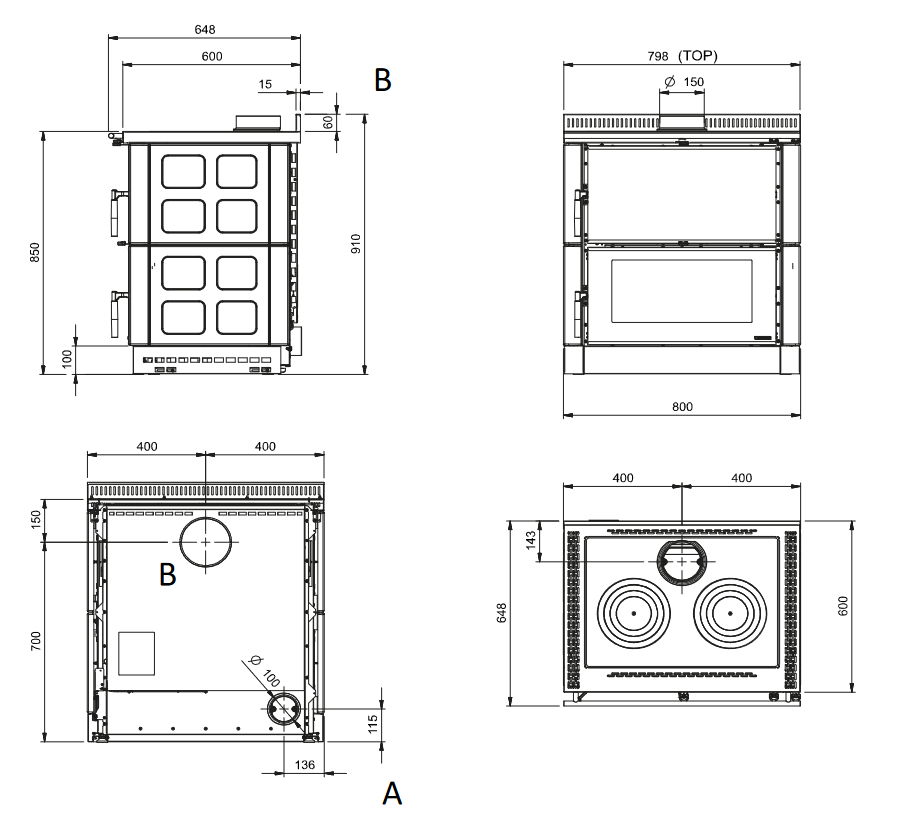 - Rauchgasausgang ausgerichteter oben, hinten, seitlich links und seitlich rechts