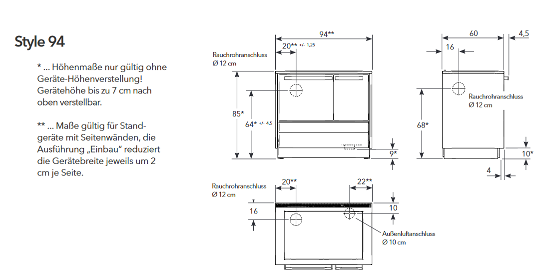 - Rauchrohranschluss seitlich: Höhe 730mm