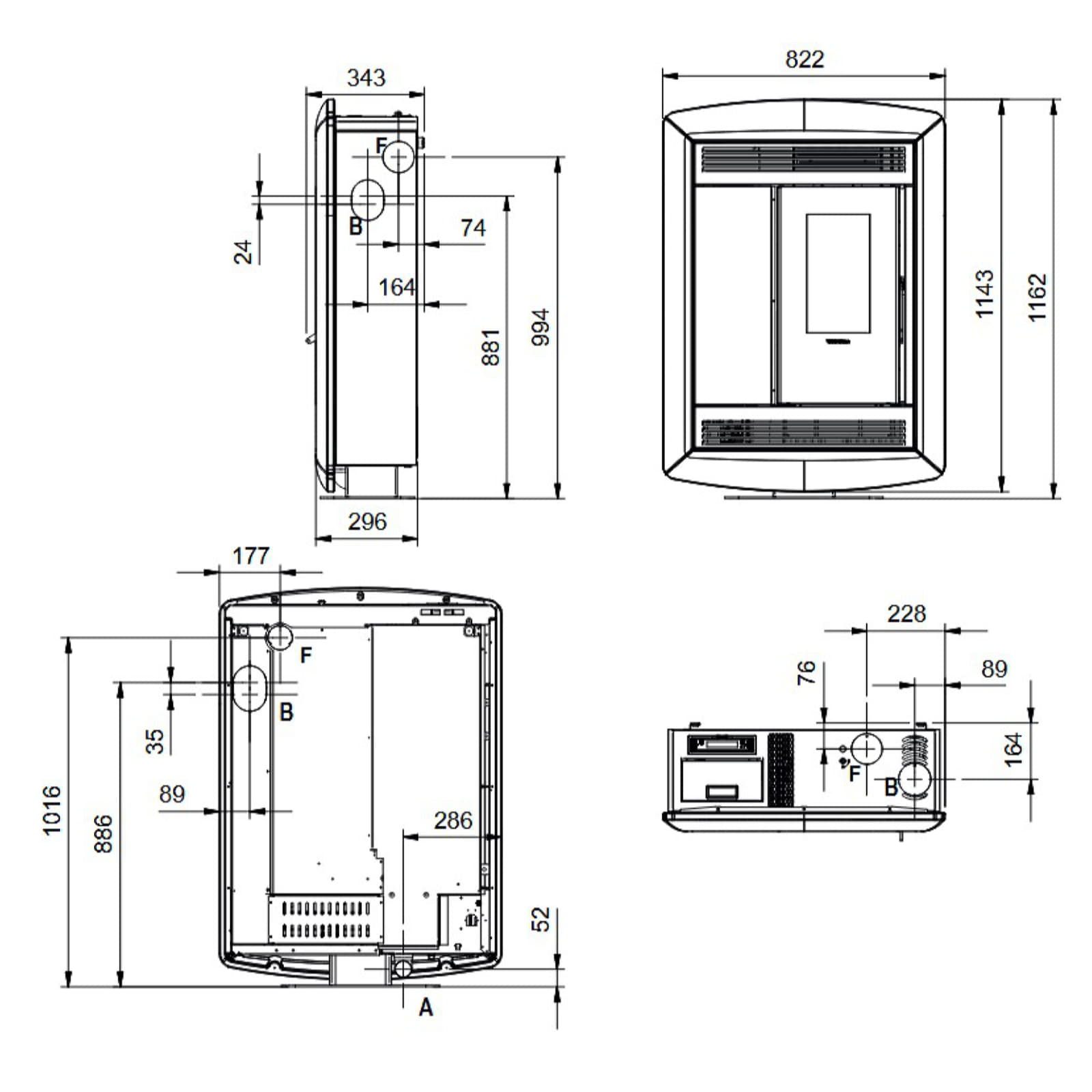 - Austrittsmöglichkeiten für den Rauchgasausgang: hinten, oben, rechts