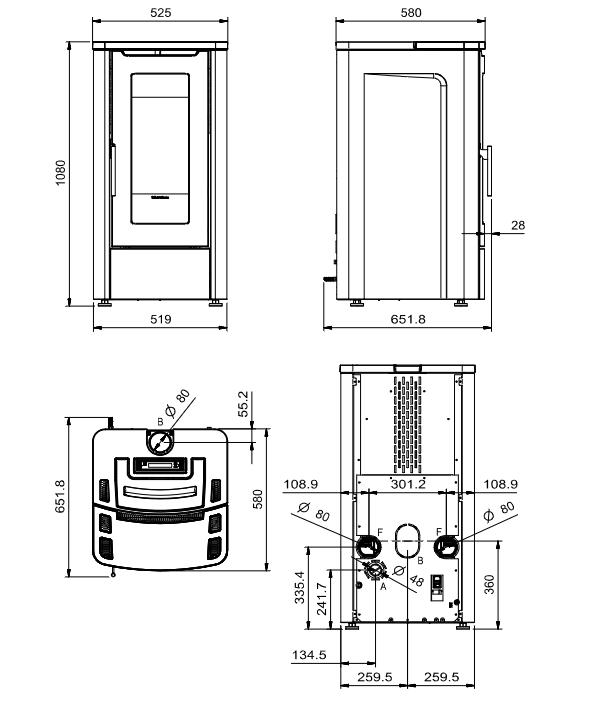 Das Besondere, die Wärme lässt sich bis zu 8 Meter in andere Räume kanalisieren, sodass Sie die Möglichkeit haben, die gewonnene Wärme auch in anderen Räumen des Hauses zu nutzen. Der Abgang ist dabei unten.