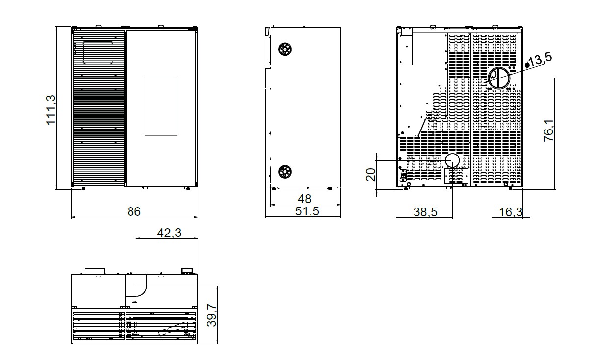 - Abstand zu brennbaren Materialien - Vorderseite 800mm, Decke 1000m