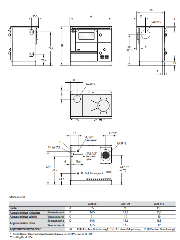 - Rauchrohranschluss hinten: Höhe 640mm